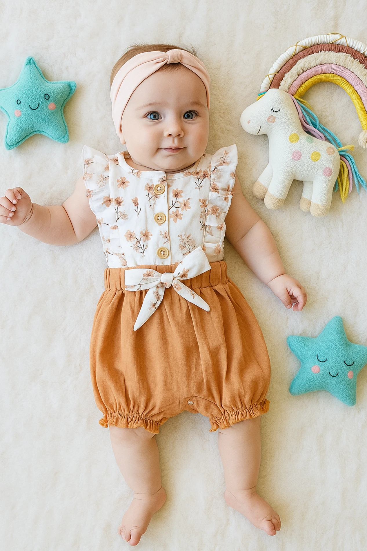 Bebek Tulum çiçek baskılı fiyonk detaylı fırfırlı tarçın 3-18 ay